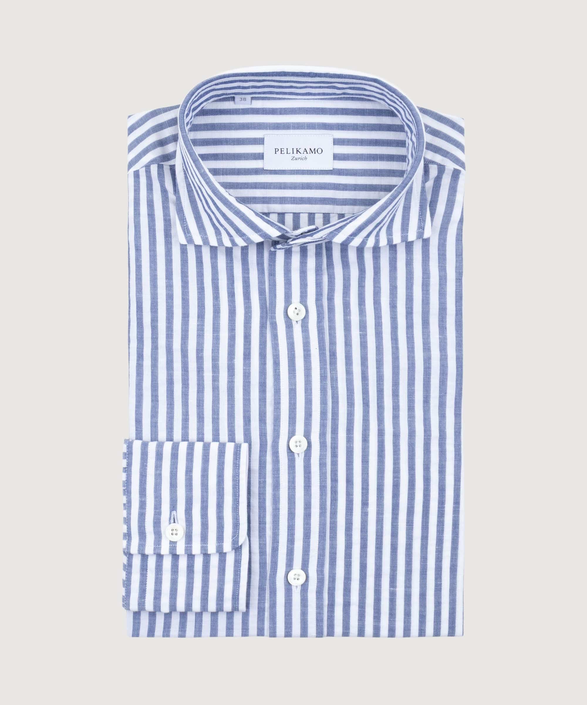 This cotton linen stripe shirt combines the crisp structure of Oxford weave with the natural breathability of linen blend fabric. The classic vertical striping creates a refined, versatile look suitable for warm-weather dressing.