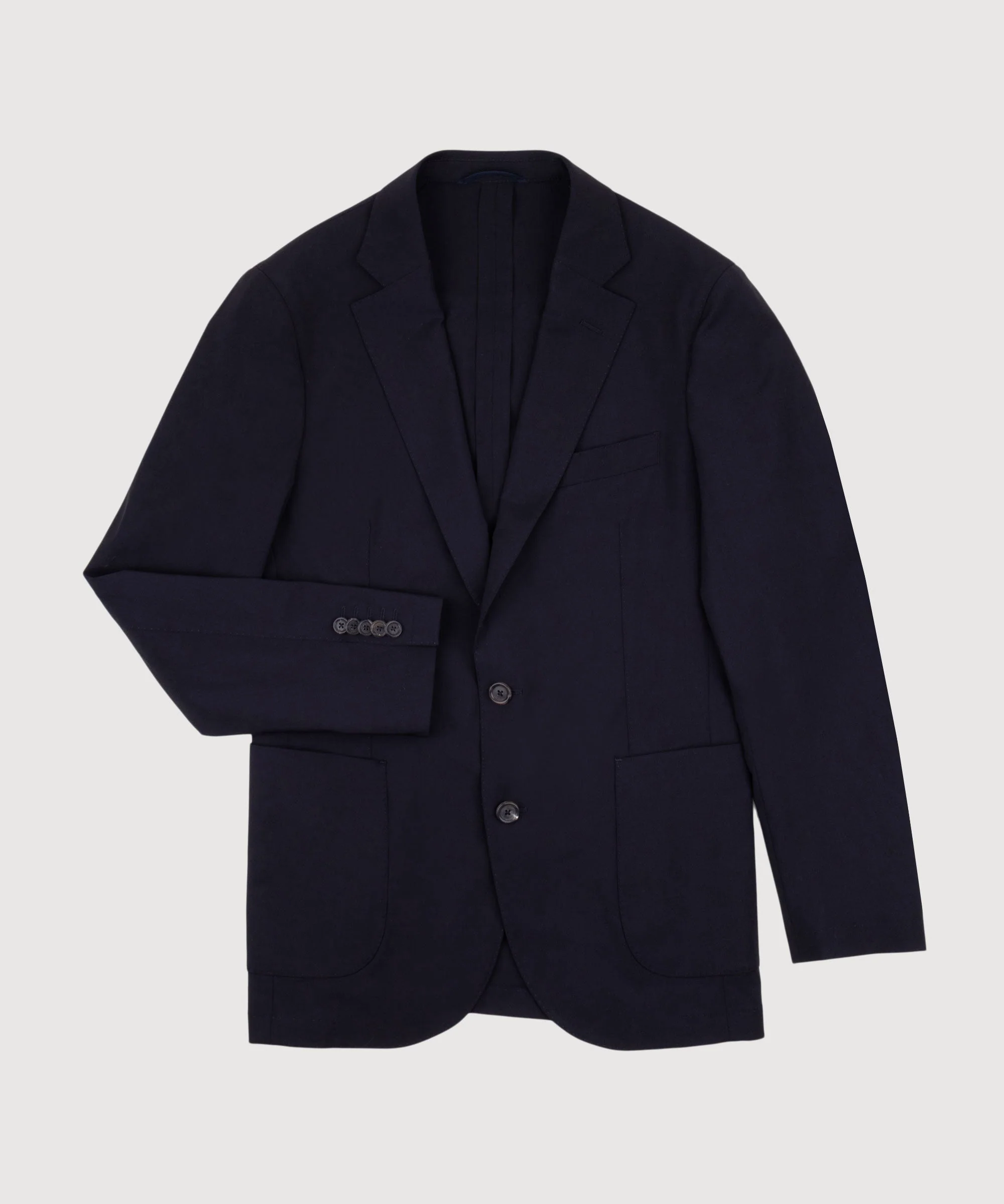 - Classic silhouette, patch pockets, two-button closure